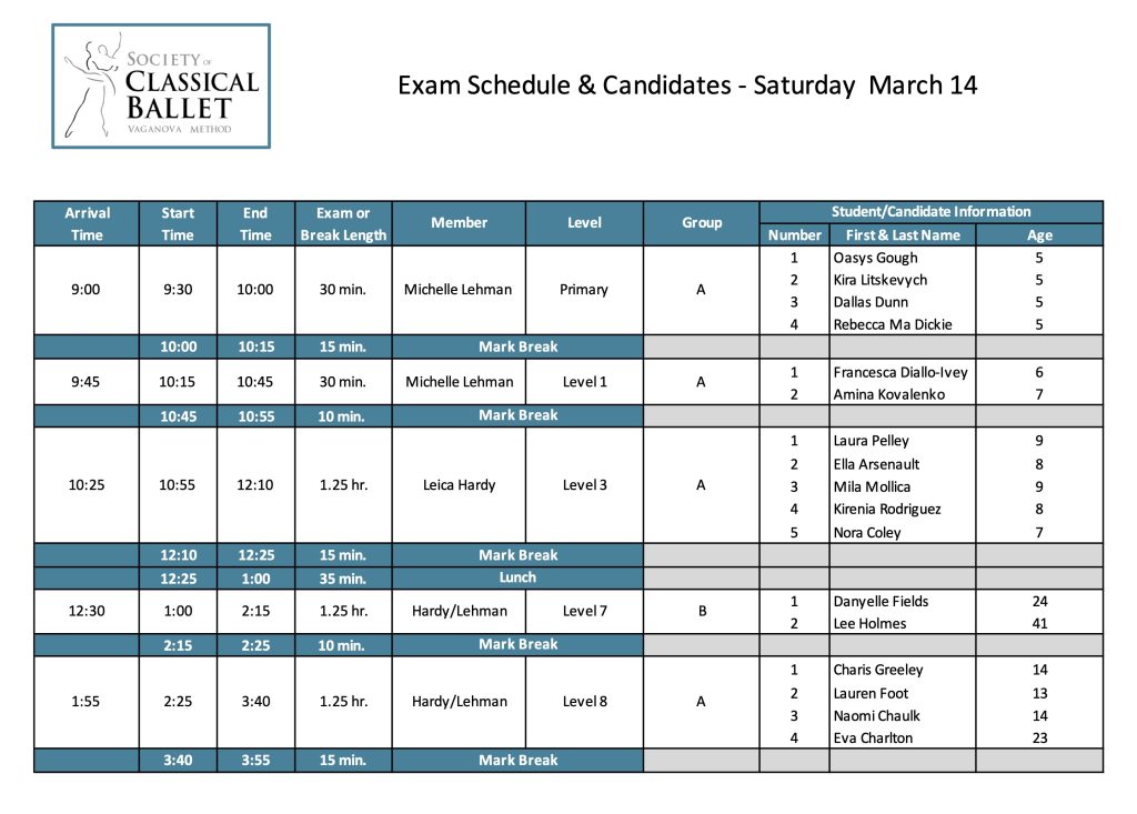 Arrival Time: Please note your arrival time on the schedule, dressed in your exam attire with hair in a bun. During that time, we will be putting numbers on dancers’ leotards, checking hair, etc. Latecomers will not be admitted to the exam room once the exam has started.